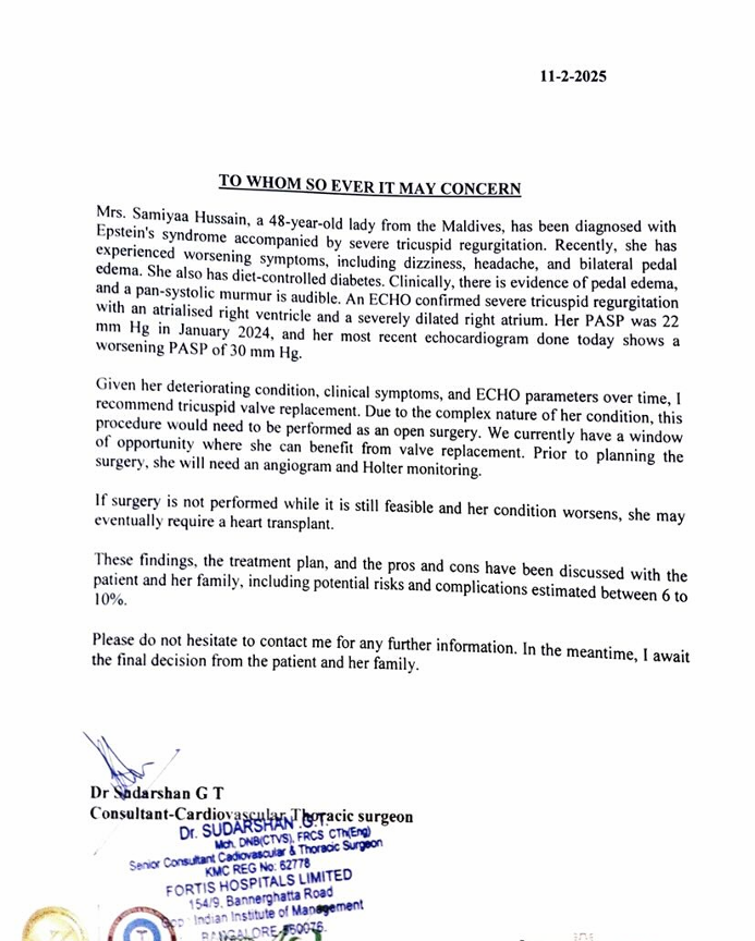 " ހިތުގެ ވޭލް ބަދަލުކުރަން ޖެހެނީ. ހިތުގެ އެއްފަޅި ހުންނަނީ ބޮޑުވެފައި. ދުޅަވެފަ. އެފަޅި އެކަށީގެންވާ ގޮތަކަށް މަސައްކަތް ނުކުރޭ. އެއޮޕަރޭޝަނަކީ ނާޒުކު ކާމިޔާބުވާނެކަމުގެ ޔަގީންކަން ކުޑަ އޮޕަރޭޝަނެއް. މިއީ މަދުން ނޫނީ ނުފެންނަ ވައްތަރެއްގެ ބައްޔެއް. މިބަލި ހުންނަ މީހަކު މިހާ ގިނަ ދުވަހު ދުނިޔޭގައި ހުރުން އެއީ ވެސް މަދުން ނޫނީ ނުފެންނަ ކޭސްއެއް ކަމަށް ޑޮކްޓަރުން ވިދާޅުވަނީ. އޮޕަރޭޝަން ކާމިޔާބު ވެދާނެ ކަމަށް އިންޑިއާގެ ޑޮކްޓަރުންވެސް ދިނީ 55 – 70 އިންސައްތަވަރު". އަސަރާއެކު ހަމީދު ފާހަގަކުރިއެވެ.