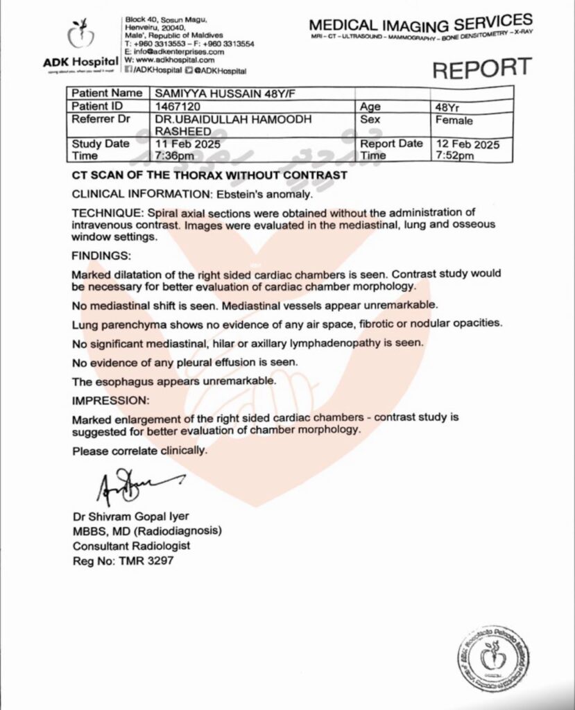 1. އަޅުގަނޑަކީ 2021 ވަނައަހަރު އޭޑީކޭ ހޮސްޕިޓަލުގަ ހިތުގެ މައިޓްރަލްވޭލް ބަދަލުކުރުމުގެ އޮޕަރޭޝަންކޮއްފަހުރިމީހެއް އޭރުގަ އާސަންދައާއި އެންސްޕާއިން އެއްކޮށްކަވަރކުރި އަތުން އެއްވެސްވަރެއް ދައްކާކަށެއްނުޖެހުނު
