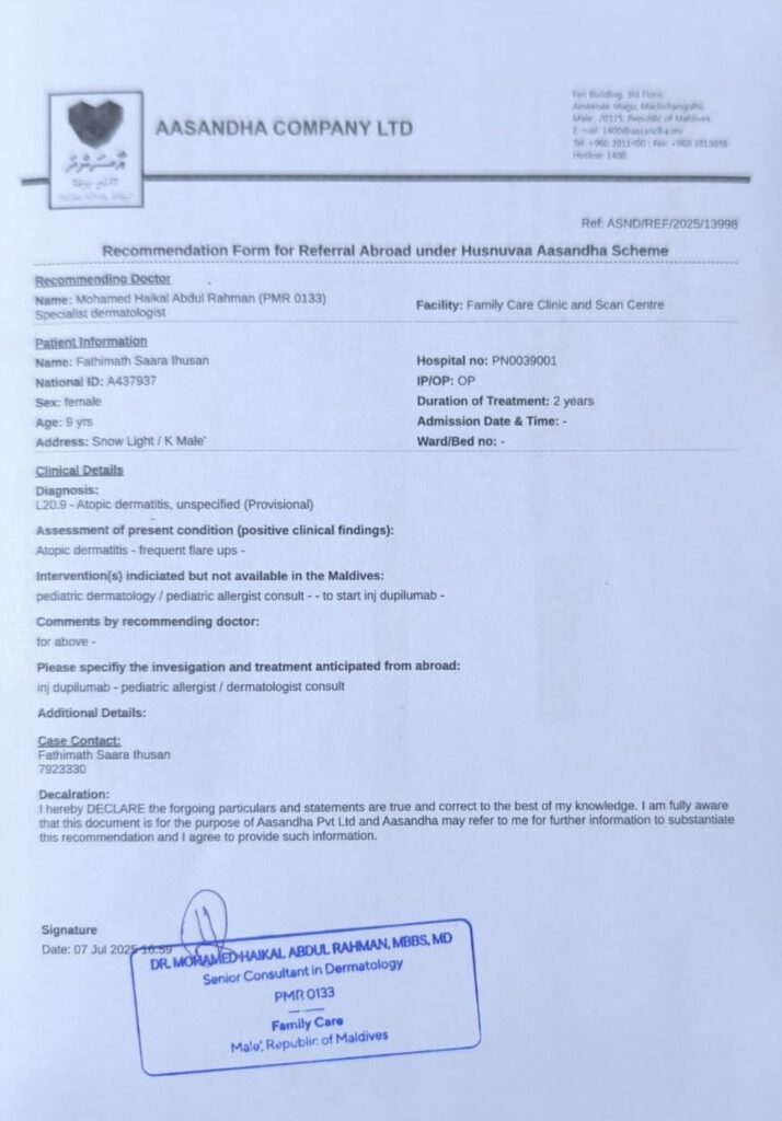 " އަޅުގަނޑުމެންގެ މާލީހާލަތު ތަންނުދޭ އެހާގިނަ ދުވަހު ފަރުވާއަށް ރާއްޖެއިން ބޭރުގައި މަޑުކުރުމަށް. ޑޮކްޓަރުން އިރުޝާދު ދީފައިވާ އިންޖެކްޝަން ޖަހާތީ މަދުވެގެން 16 ދުވަހު މަޑުކުރަންޖެހޭ. އިންޖެކްޝަނަށް ޖުމްލަ 15000 ޑޮލަރު ހޭދަވޭ. އެއީ 6 މަސްދުވަހުގެ އިންޖެކްޝަނަށް. އާސަންދަ ކަވަރ ކުރަނީ އިންޖެކްޝަނަށް ހޭދަވާ ޚަރަދުގެ ދެބައިކުޅައެއްބައި. އަދި ހުރުމާއި ކެއުމާއި ޓްރާންސްޕޯޓަށް ބޮޑުއެއްޗެއް ހޭދަވާނެ. ދަރިފުޅުގެ ކިޔެވުމަށް އަސަރުކުރާތީ އިތުރަށް ފަރުވާއަށް ނުގޮސް މަޑުކުރެވެންވެސް ނެތް". ހިތްދަތިކަމާއެކު ސާރާގެ މަންމަ ކިޔައިދިނެވެ.