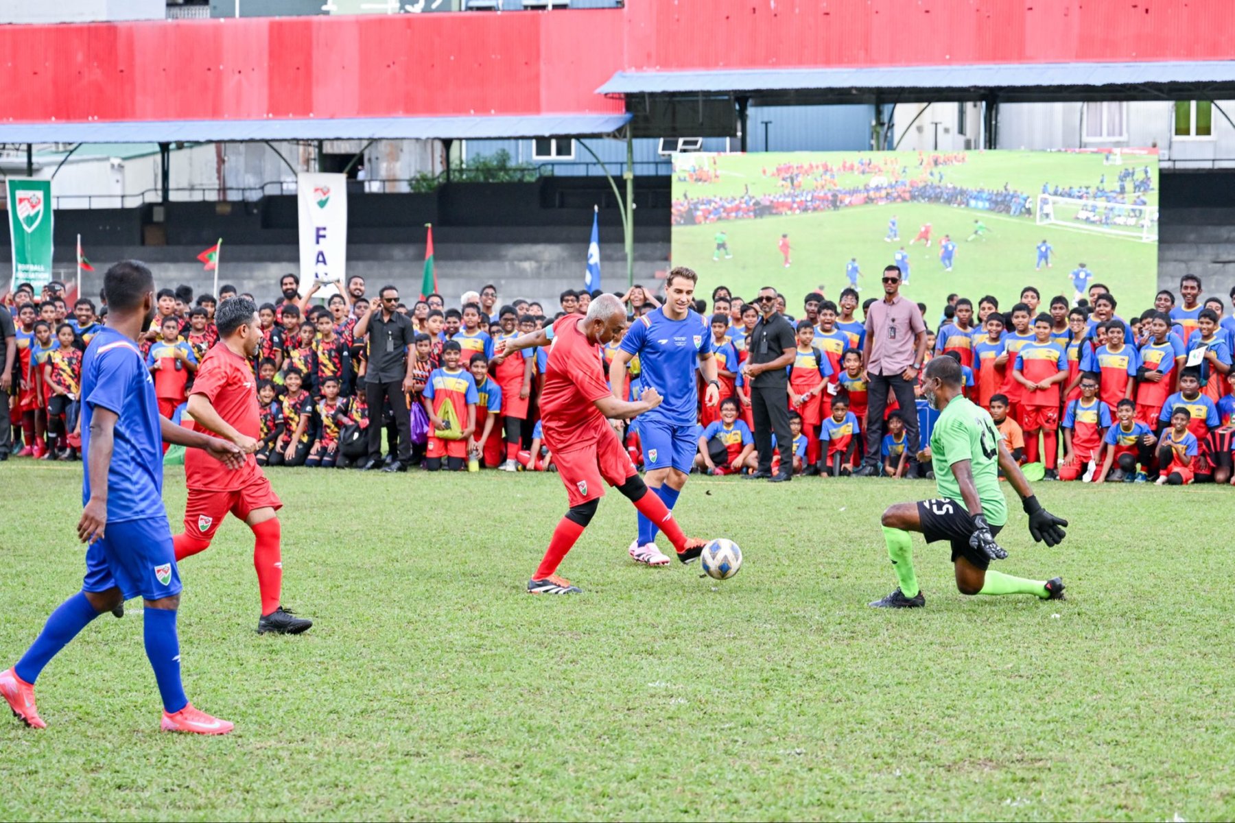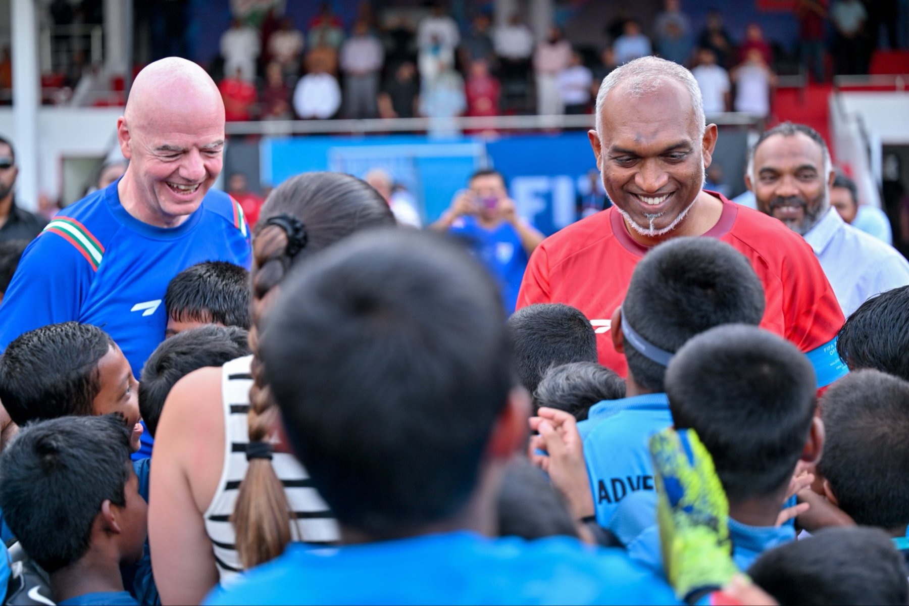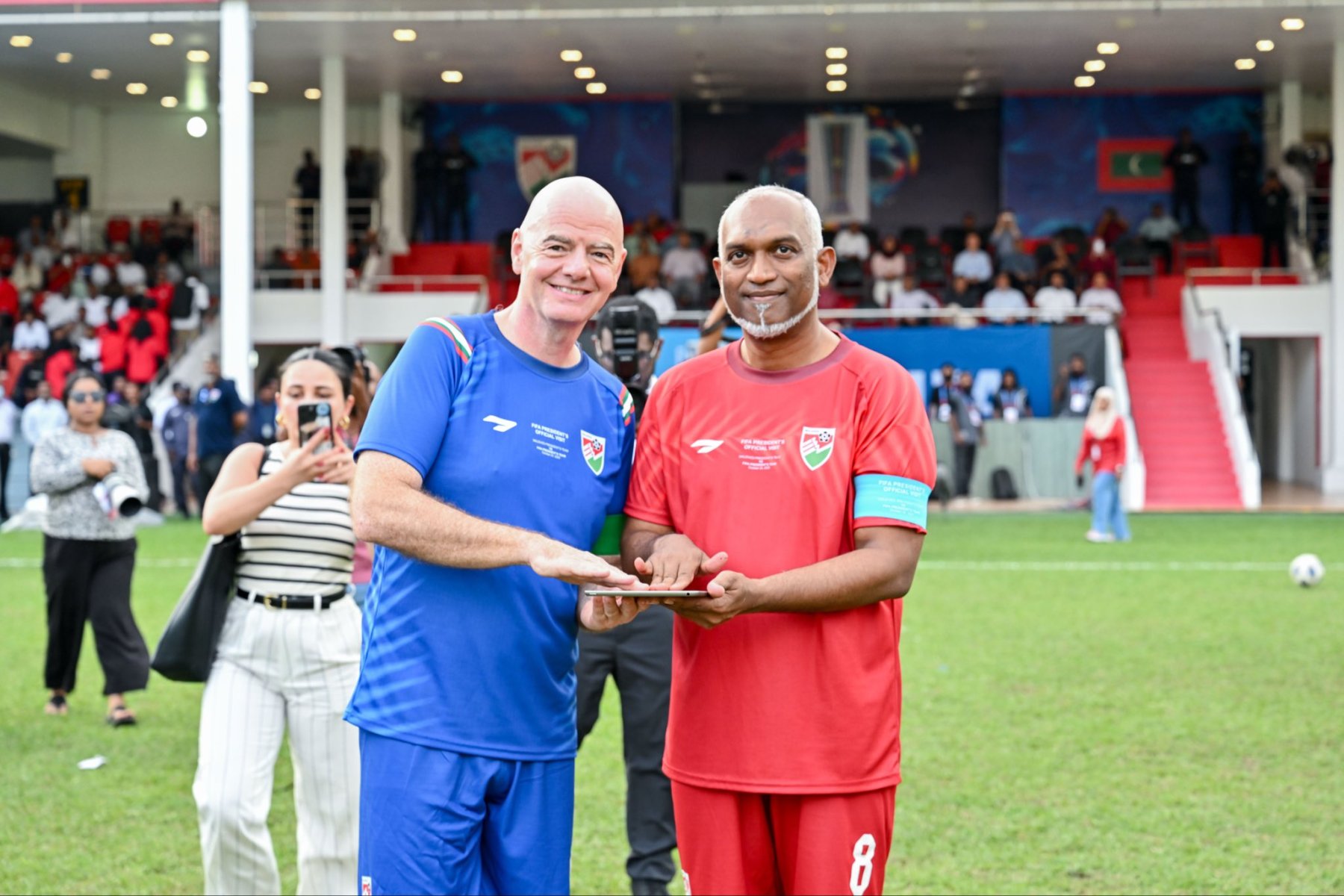 ދުނިޔޭގެ ފުޓްބޯޅައިގެ މައި ޖަމްއިއްޔާ 'އިންޓަނޭޝަނަލް ފެޑެރޭޝަން އޮފް އެސޯސިއޭޝަން ފުޓްބޯލް' (ފީފާ) ގެ ރައީސް ޖިއަނީ އިންފަންޓީނޯ ރާއްޖެއަށް ކުރެއްވި ޒިޔާރަތުގެ ތެރެއިން މިއަދު ވަނީ ޤައުމީ ދަނޑުގައި ޚާއްސަ ފުޓްބޯޅަ މެޗެއް ކުޅެފައެވެ. މި މެޗުގައި ފީފާގެ ރައީސާއެކު ރާއްޖޭގެ ރައީސުލްޖުމްހޫރިއްޔާ ޑރ. މުހައްމަދު މުޢިއްޒު ވެސް ވަނީ ބައިވެރިވެޑައިގެންފައެވެ. ރާއްޖޭގެ ކުލަބުތަކާއި އެކަޑަމީތަކުގެ ޒުވާން ކުޅުންތެރިން ދަނޑަށް ދިޔައިރު މިއަދުގެ ޚާއްސަ މެޗުގައި ނައިބު ރައީސްގެ އިތުރުން ސަރުކާރުގެ ބައެއް އިސްވެރިން ވަނީ ބައިވެރިވެފައެވެ. މިމެޗު 4-6 އިން ކާމިޔާބު ކުރީ ފީފާގެ ޓީމެވެ.