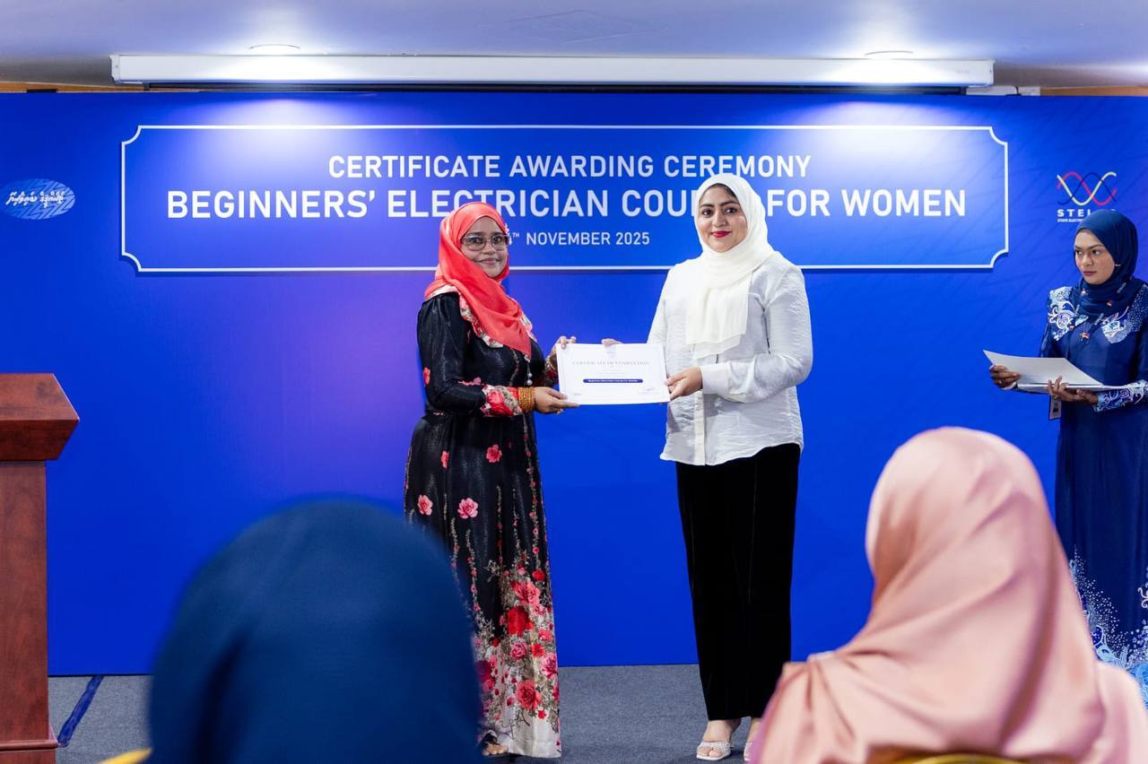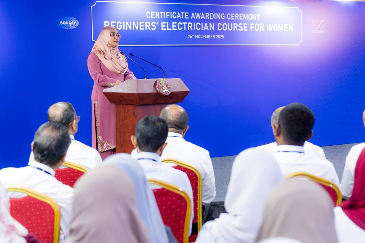 ސްޓެލްކޯއިން ހިންގި ބިގިނަރސް އިލެކްޓްރީޝަން ކޯސް ފޯރ ވިމެން ފުރިހަމަކުރި ބައިވެރިންނަށް ސެޓްފިކެޓް ދިނީ މިއަދު ބޭއްވި ޚާއްސަ ރަސްމިއްޔާތުގައެވެ. މިރަސްމިއްޔާތު ޝަރަފުވެރިކޮށްދެއްވީ ރައީސުލްޖުމްހޫރިއްޔާ ޑރ. މުޙައްމަދު މުޢިއްޒުގެ އަނބިކަނބަލުން، މެޑަމް ސާޖިދާ މުޙައްމަދެވެ. ކޯހުގެ ބައިވެރިންނާ ސެޓްފިކެޓް ހަވާލުކޮށްދެއްވީ މެޑަމް ސާޖިދާ މުޙައްމަދާއި، ސްޓެލްކޯގެ މެނޭޖިންގ ޑިރެކްޓަރ އަޙްމަދު ޝަމާހް ޝަރީފާއި ސްޓެލްކޯގެ ޑެޕިއުޓީ މެނޭޖިންގ ޑިރެކްޓަރ ޢައިޝަތު މުޒްނާއެވެ. ޖުމްލަ 7 ބެޗަކަށް ބަހާލައިގެން ކުރިއަށްގެންދިޔަ މި ކޯހުގައި ބައިވެރިވެ 116 އަންހެނުން ވަނީ ކޯސް ފުރިހަމަކޮށްފައެވެ. މި ކޯހުގައި ޓްރެއިނަރުންގެ ގޮތުގައި ބައިވެރިވެވަޑައިގެންފައިވަނީ މި ކުންފުނީގައި ތިބި ޢިލްމާއި ހުނަރުގެ ގޮތުން މި ދާއިރާގެ ތަޖުރިބާކާރު ބޭފުޅުންނެވެ. މި ކޯހުގެ މަޤުޞަދަކީ ކަރަންޓުގެ ދާއިރާއަށް ކަނބަލުންގެ ހިތް ޖައްސުވައި، އެ ދާއިރާއިން ކުރިއަށްދިއުމަށް ހިތްވަރުދީ، އެ ދާއިރާއިން ފިރިހެނުންނާއި އެއްހަމައެއްގައި މަސައްކަތް ކުރުމުގެ ފުރުޞަތު ފަހިކޮށްދިނުމަށްޓަކައި ދާއިރާއަށް އަހުލުވެރިކޮށް، އެމަގަށް ހަރުދަނާ ބިންގަލެއް އަޅައިދިނުން ކަމަށް ސްޓެލްކޯއިން ވަނީ މައުލޫމާތު ދީފައެވެ.