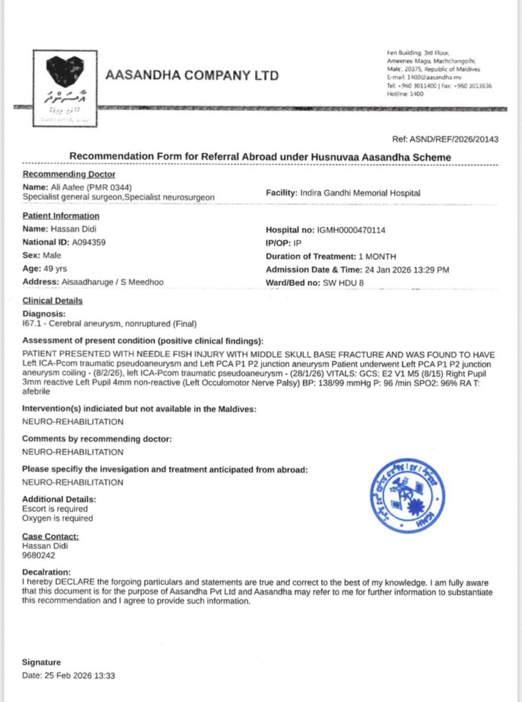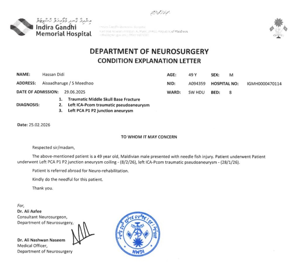 " އުސޫލު އޮންނަ ގޮތުން ނިއުރޯ ރިހެބިލިޓޭޝަން އަށް އާސަންދައިގެ ދަށުން ފޮނުވަނީވެސް 2 ހަފްތާއަށް. އެކަމަކު ޑޮކްޓަރ އަޅުގަނޑުމެންނަށް މައުލޫމާތުދިން ބޭބެގެ ހާލަތު އަމިއްލައަށް އުޅެވޭވަރު ކުރުމަށް 9 މަސްދުވަސްވެސް ނަގާފާނޭ ފަރުވާއަށް. ސީދާ ރަނގަޅުވާނީ ކިހާ ދުވަހަކަށް ފަރުވާދީގެންކަން އެހެން ބުނަން ޑޮކްޓަރަށްވެސް ނޭނގޭކަމަށް. ނަރުހަކާއެކީގައި ފޮނުވާނީ. އެއީ އޮކްސިޖަން ބޭނުންވާތީ. ބޭބެ ގޮވައިގެން ދާއިރު ބޭބެގެ އަންހެނުންނާއި ކުޑަދަރިފުޅު އަދި އަޅުގަނޑު ނޫނީ އެހެން އާއިލާ މީހަކު ދާނެ. ބޭބެގެ އަންހެނުންނަކީ އިންޑިއާ މީހަކަށްވުމުން އެކައުންޓެއް ނުހުރޭ".