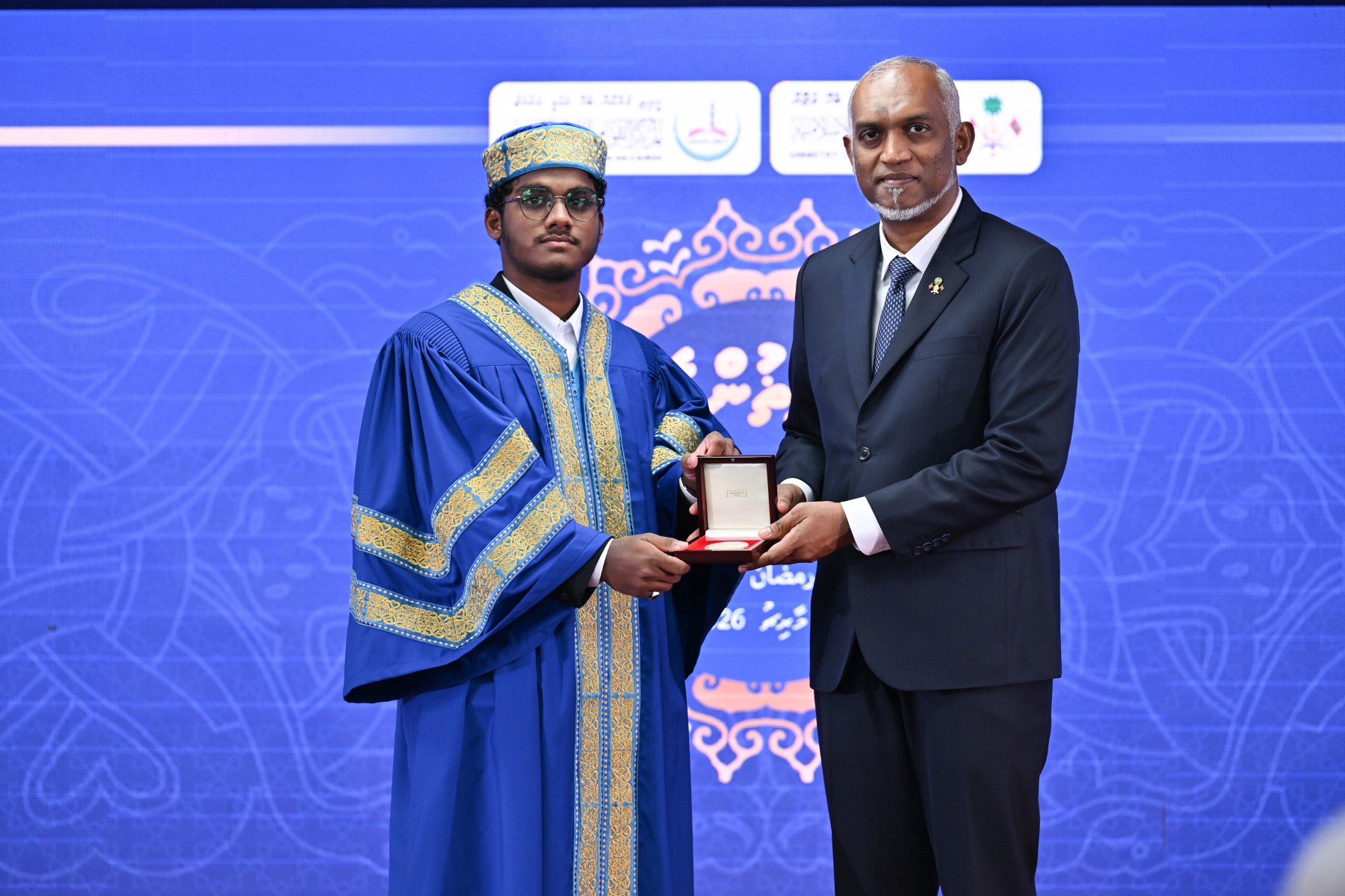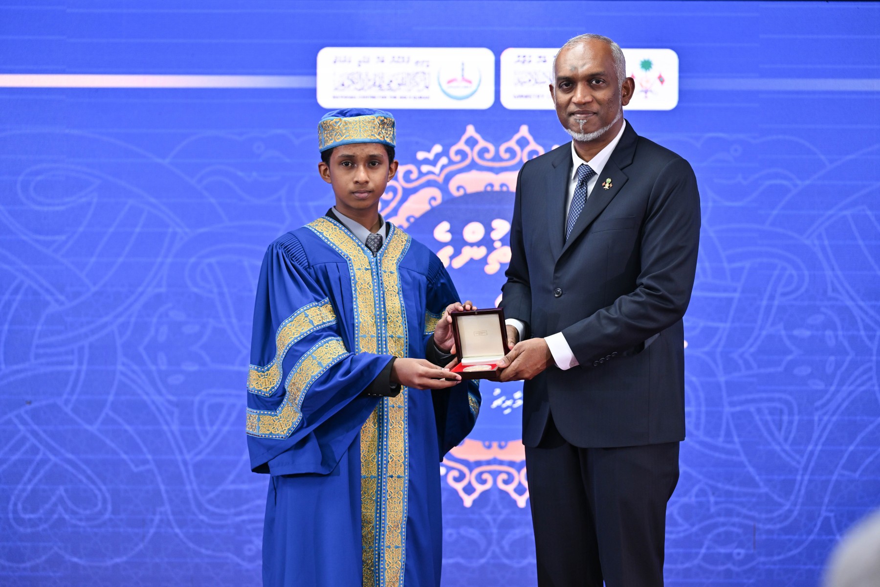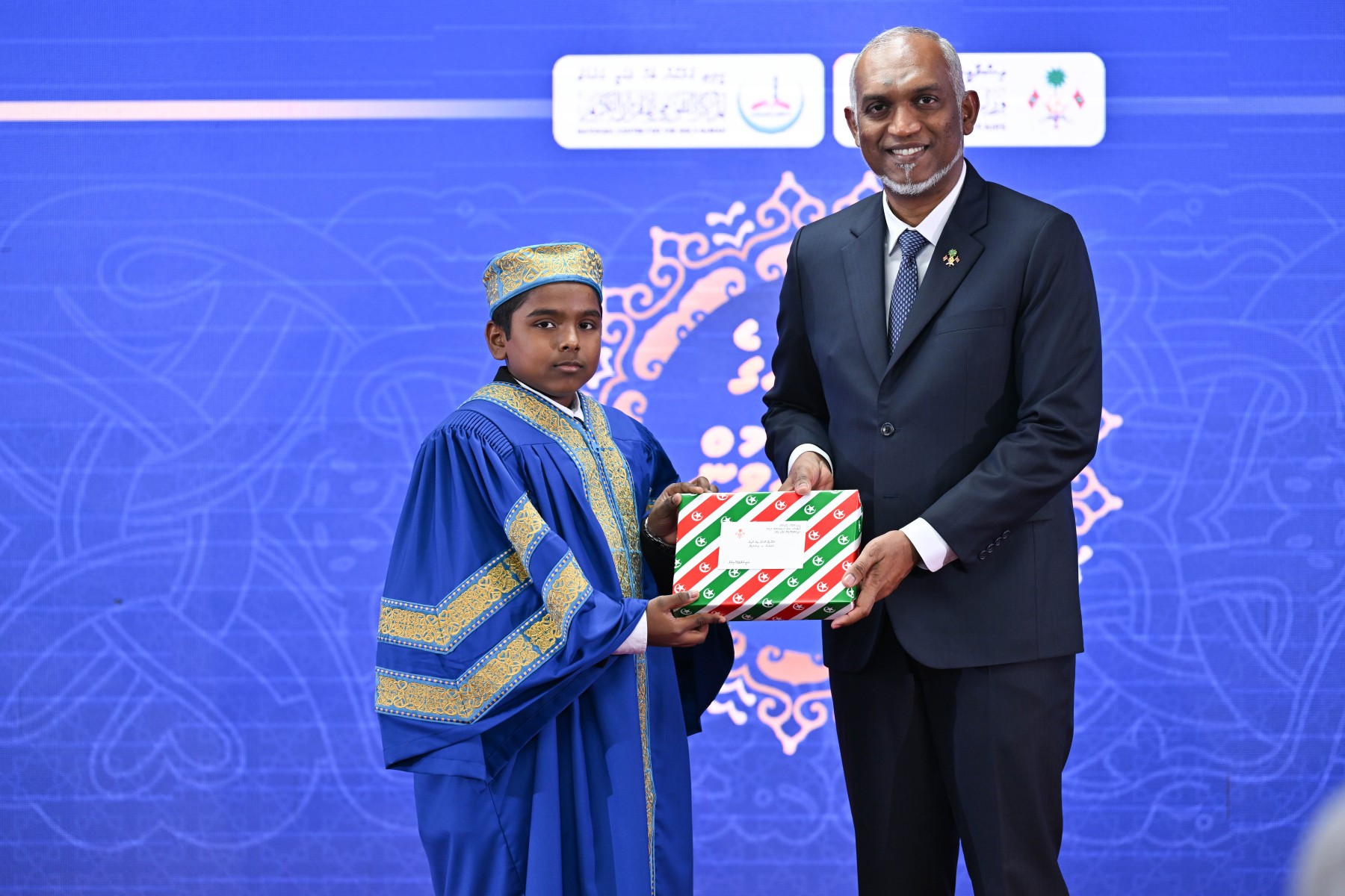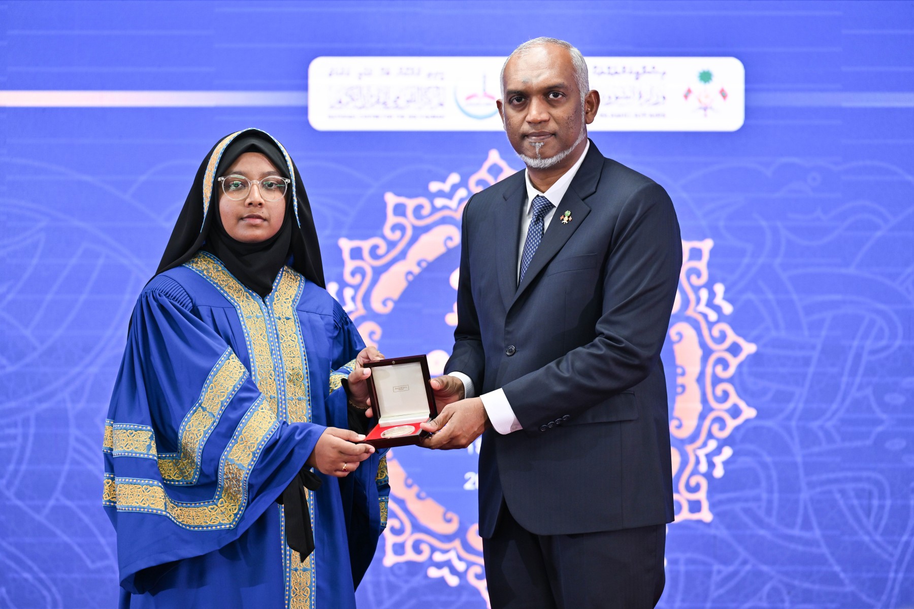 އިސްލާމީ މަރުކަޒުގެ ޖަލްސާކުރާ މާލަމުގައި ކުރިއަށްގެންދެވި ރަސްމިއްޔާތުގައި ރައީސުލްޖުމްހޫރިއްޔާ ވަނީ، އަލަށް ކީރިތި ޤުރުއާން ހިތުދަސްކޮށް ދަސްވެނިވި 31 ޙާފިޒުންނަށް ސަނަދާއި، ރައީސުލްޖުމްހޫރިއްޔާ ދެއްވާ އިނާމާއި މެޑަލް ހަވާލުކޮށްދެއްވާފައެވެ. މިއީ 1446 ވަނަ އަހަރުގެ ރަމަޟާން މަހުން ފެށިގެން 1447 ވަނަ އަހަރުގެ ރަމަޟާން މަހާ ހަމައަށް ކީރިތި ޤުރުއާން ހިތުދަސްކޮށް، ކީރިތި ޤުރުއާނާ ބެހޭ ޤައުމީ މަރުކަޒުން ކަނޑައަޅުއްވާފައިވާ ޝަރުޠުތަކާ އެއްގޮތަށް، ޙިފްޡު އިމްތިޙާނު ކޮމިޓީއަށް ކިޔައިދީ، އަލަށް ދަސްވެނިވި ޙާފިޒުންނެވެ. މި އަހަރު ދަސްވެނިވެފައިވަނީ، އަންހެން 19 ޙާފިޒުންނާއި، ފިރިހެން 12 ޙާފިޒުންނެވެ. އެއީ 12 އަހަރާއި 21 އަހަރާ ދެމެދުގެ 23 ޙާފިޒުންނާއި، 21 އަހަރުން މަތީގެ 8 ޙާފިޒުންނެވެ. މިރަސްމިއްޔާތުގައި ރައީސުލްޖުމްހޫރިއްޔާ ވަނީ، އިތުރު 18 ޙާފިޒުންނަށް ރައީސުލްޖުމްހޫރިއްޔާ ދެއްވާ އިނާމާއި މެޑަލް ހަވާލުކޮށްދެއްވާފައެވެ. މިއީ 3 ސެޕްޓެމްބަރު 2024 އިން 18 މާރިޗު 2025 ގެ ނިޔަލަށް ކީރިތި ޤުރުއާން ހިތުދަސްކޮށް، ކީރިތި ޤުރުއާނާ ބެހޭ ޤައުމީ މަރުކަޒުން ކަނޑައަޅުއްވާފައިވާ ޝަރުޠުތަކާ އެއްގޮތަށް، ޙިފްޡު އިމްތިޙާނު ކޮމިޓީއަށް ކިޔައިދީ ސަނަދު ޙާޞިލުކޮށްފައިވާ ޙާފިޒުންނެވެ.