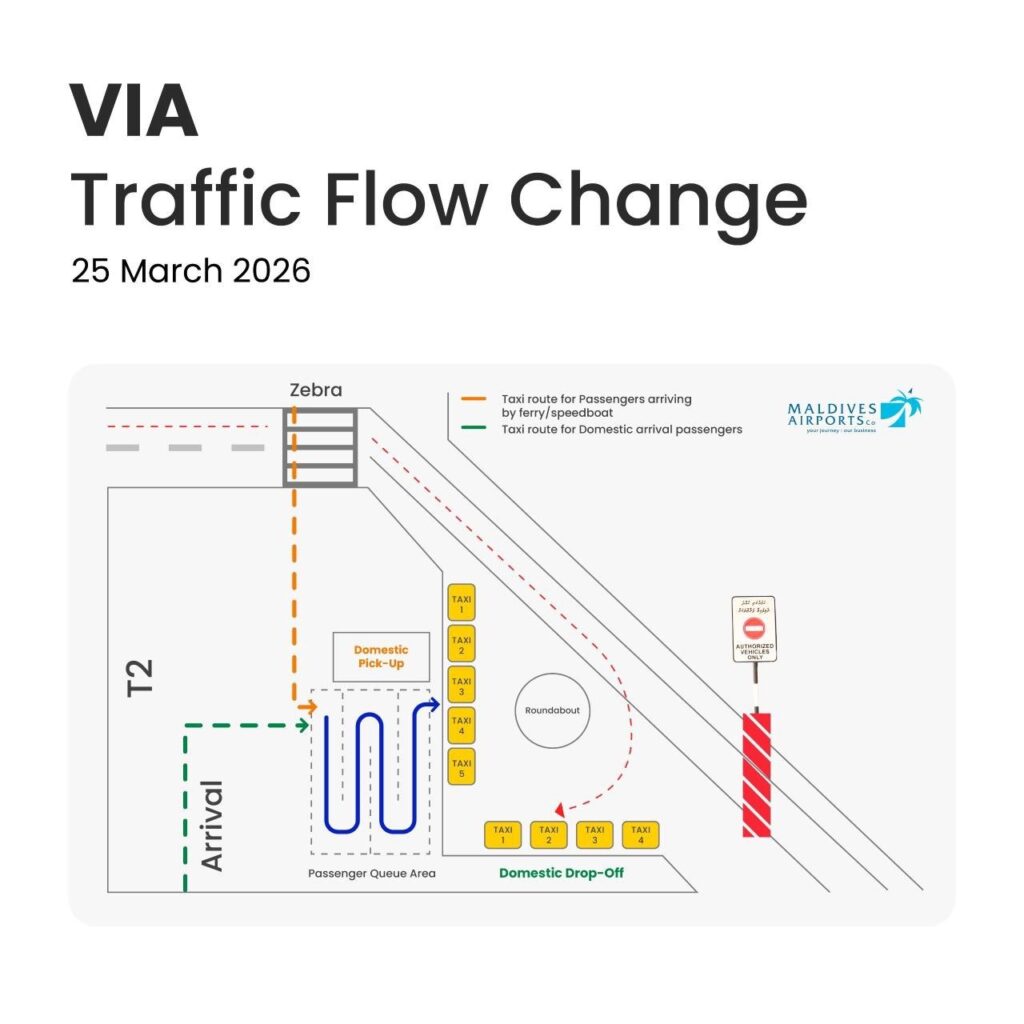 ވެލާނާ އިންޓަނޭޝަނަލް އެއަރޕޯޓުގެ ޓްރެފިކް ފްލޯއަށް މިއަދުން ފެށިގެން ބައެއް ބަދަލުތައް ވަނީ ގެނެސްފައެވެ. ވެލާނާ އިންޓަރނޭޝަނަލް އެއަރޕޯޓުގެ ޓާރމިނަލް 2 ބޭނުންކުރާ ފަސިންޖަރުންނަށް ލުއިފަސޭހަ އިންތިޒާމުތަކެއް ހަމަޖައްސައިދިނުމުގެ ގޮތުން 25 މާރިޗް 2026 (މިއަދު)ގެ ހެނދުނު 10.00 އިން ފެށިގެން، ޓަރމިނަލް 2 ގެ ކުރިމަތީގައިވާ ސަރަހައްދަކީ ފަސިންޖަރުންނަށް ޓެކްސީތަކަށް އަރާ ފޭބޭނެ ސަރަހައްދެއްކަމުގައި ވަނީ ކަނޑައަޅައިފައެވެ.